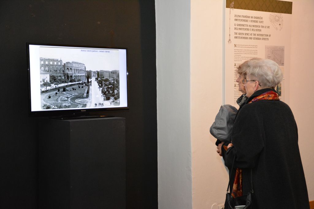 Izložba ”Arena i okolni parkovi – nekad i danas” daje pregled parkova i javnih zelenih površina koje se nalaze neposredno uz pulski amfiteatar, najznačajniju rimsku građevinu na tlu Hrvatske. Grafikama, fotografijama i razglednicama iz fundusa Arheološkog muzeja Istre, dostupne literature i dokumentacije, katastarskih karata, planova grada i arhivskog gradiva, ali i suvremenim umjetničkim djelima u tehnici akvarela i keramike, proučen je i prikazan prostorni razvitak okolice Arene. Redoslijedom njihova nastajanja, obrađeni su Park Karolina, Park Valerija, Serpentina, Park ispod Arene te zelena površina na raskrižju Amfiteatarske i Istarske ulice. Kako bi se predstavili parkovi danas, stare razglednice, viđene očima pulske umjetnice Monike Petrović, ”pretočene” su tehnikom akvarela u suvremena umjetnička djela. Osim slikama, umjetnica se predstavlja keramičkim predmetima – mirisnim keramičkim pločicama sa tlocrtnim dispozicijama parkova i posudama s motivima listova biljaka zastupljenih u parkovima.