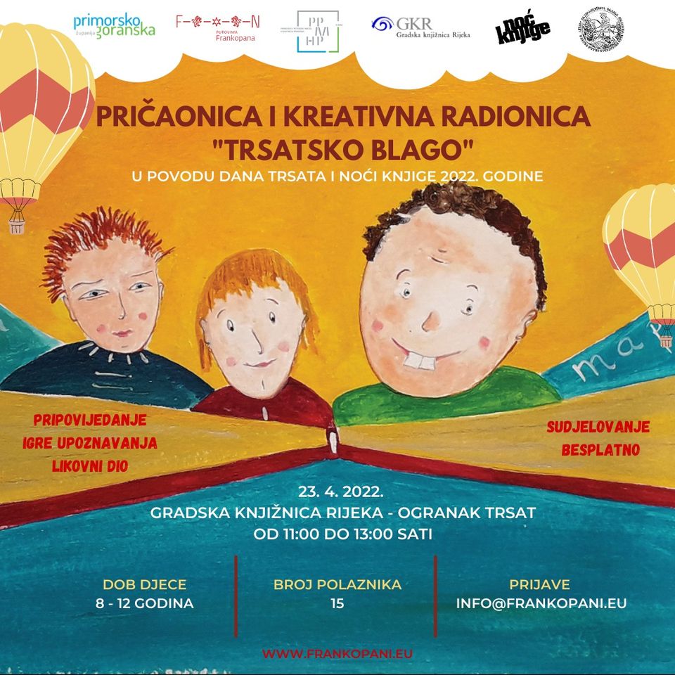 Gradskoj knjižnici Rijeka – Ogranak Trsat organiziraju pričaonicu i kreativnu radionicu pod nazivom “Trsatsko blago” za djecu u dobi od 8 do 12 godina, u subotu 23. travnja 2022. od 11:00 – 13:00 sati. Glavni element programa je frankopanska slikovnica “Trsatsko blago” vezana uz lokalitet Kaštela Trsat i pripadajućeg interpretacijskog centra.